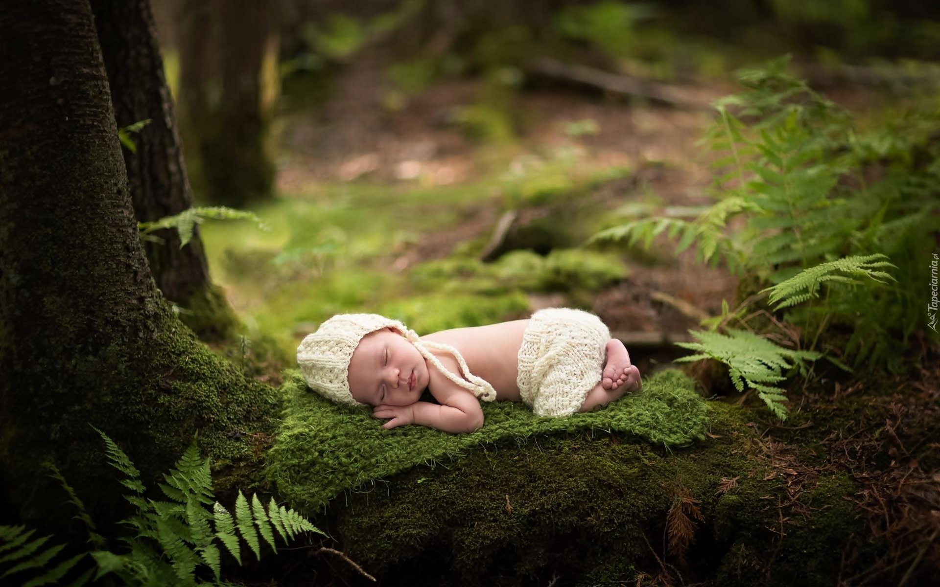 Edytor tapety: Niemowlę śpi w lesie pośród mchów i paproci