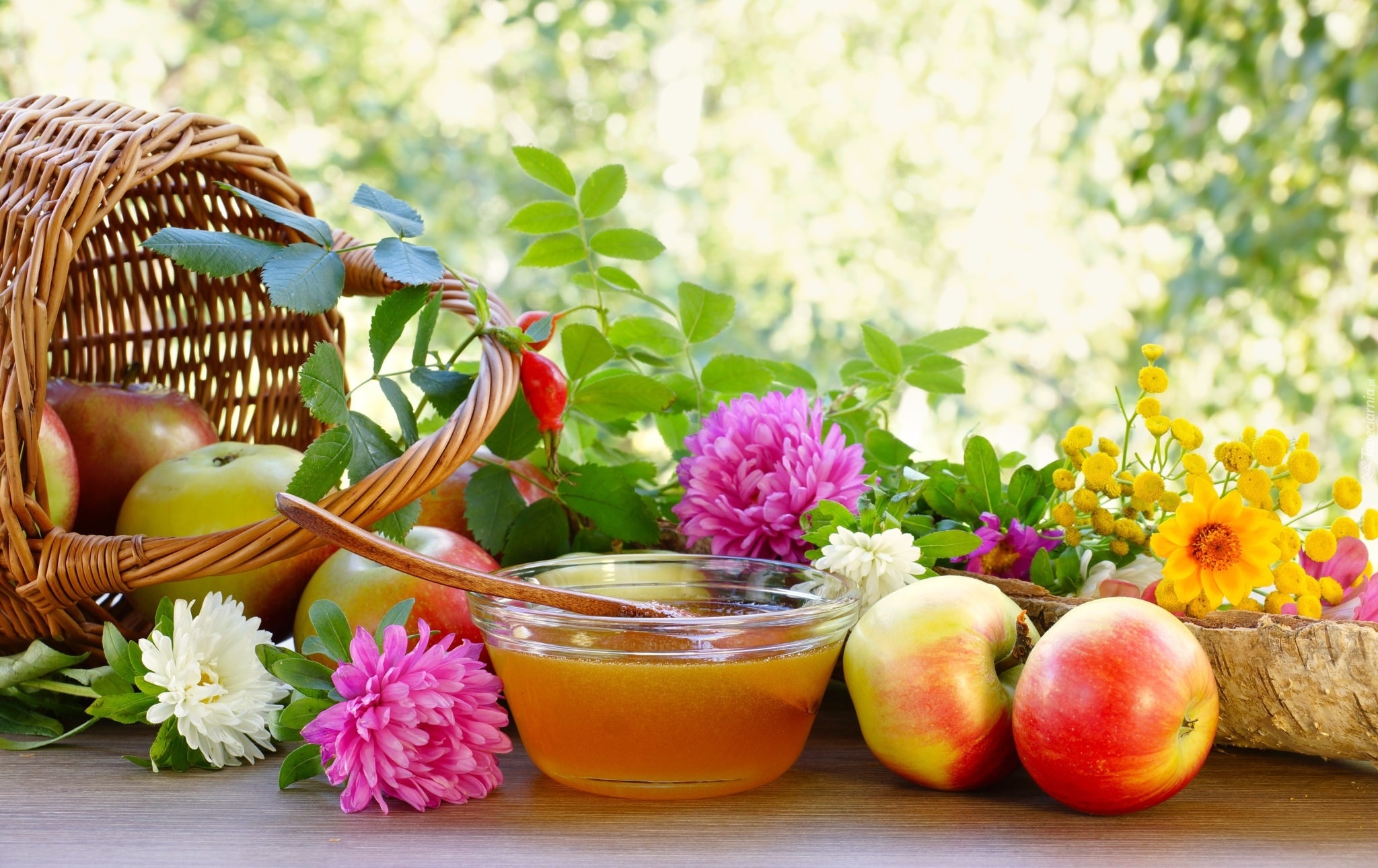 Edytor tapety: Kompozycja z jesiennymi kwiatami i owocami