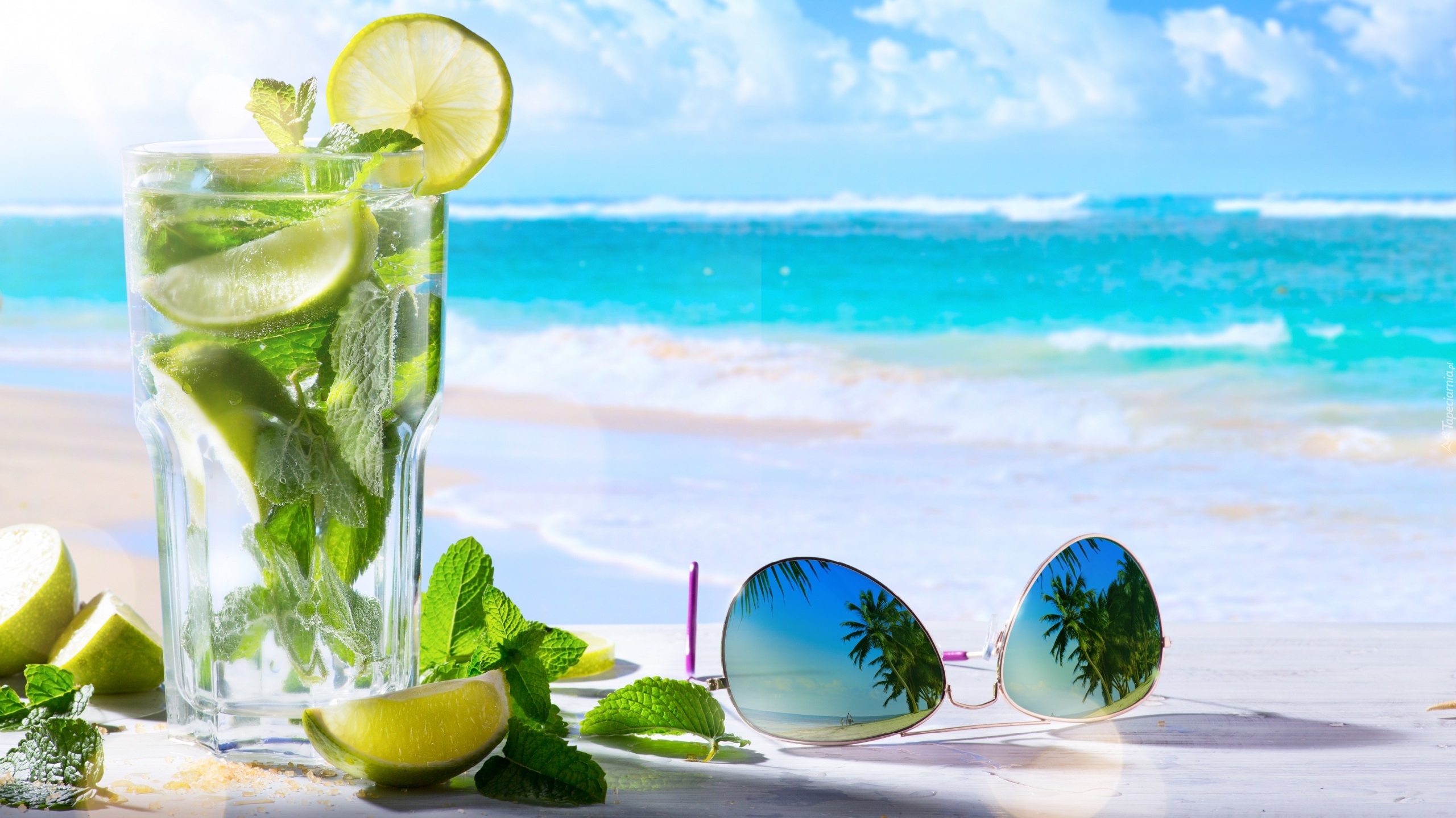 Edytor tapety: Lemoniada z limonkami w szklance obok okularów przeciwsłonecznych