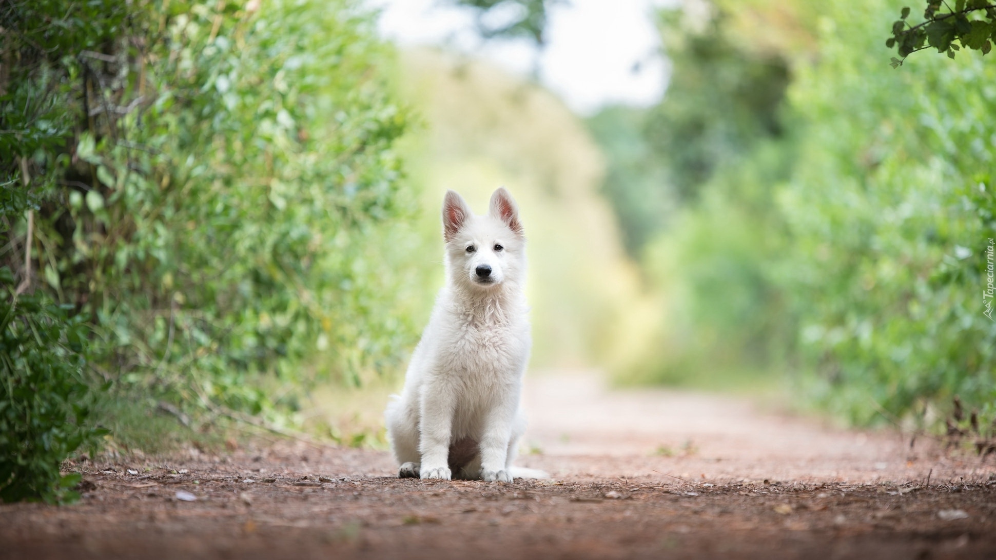 Edytor tapety: Biały owczarek szwajcarski pośród krzewów w parkowej alejce