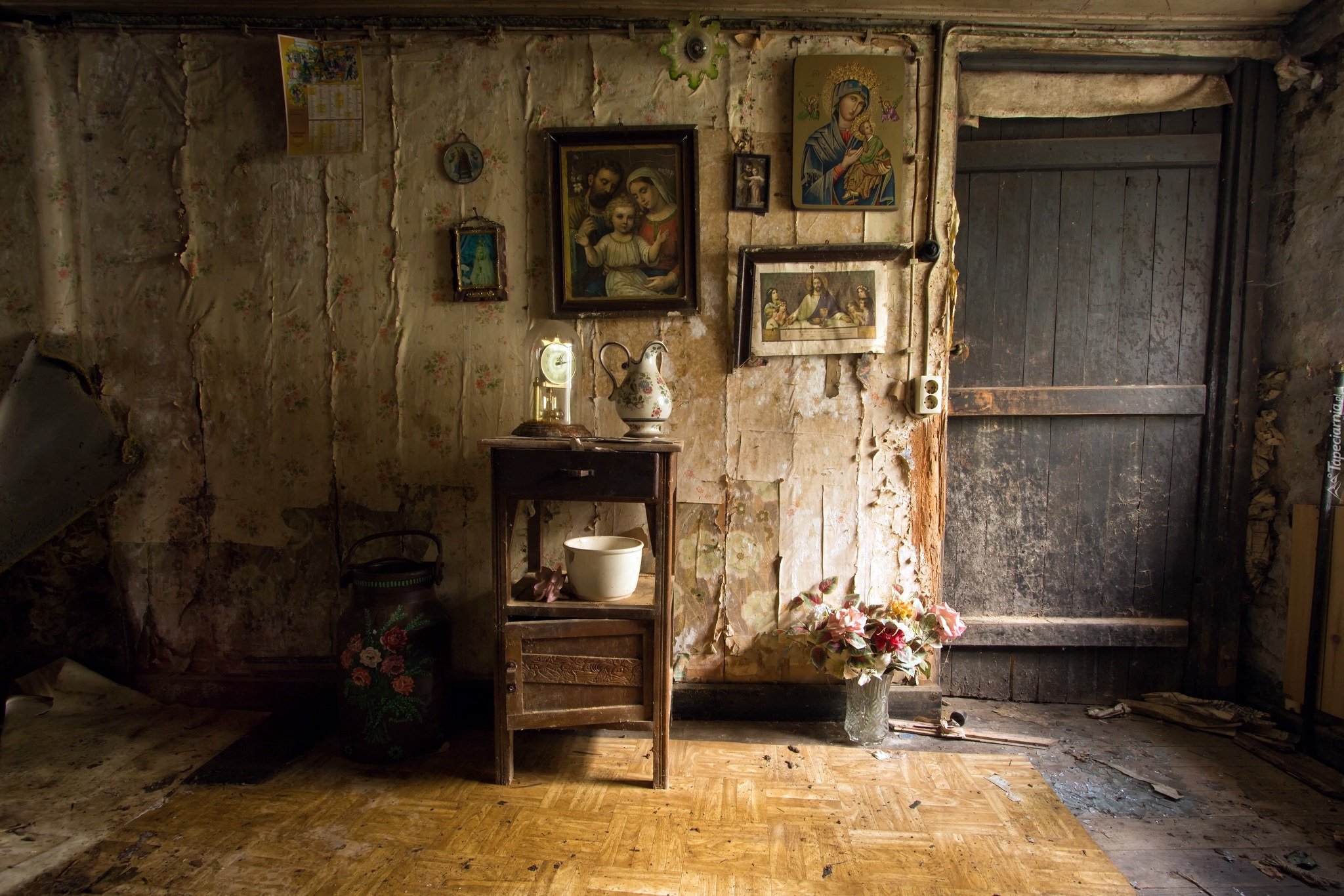 Edytor tapety: Święte obrazy na ścianie w zniszczonym pomieszczeniu