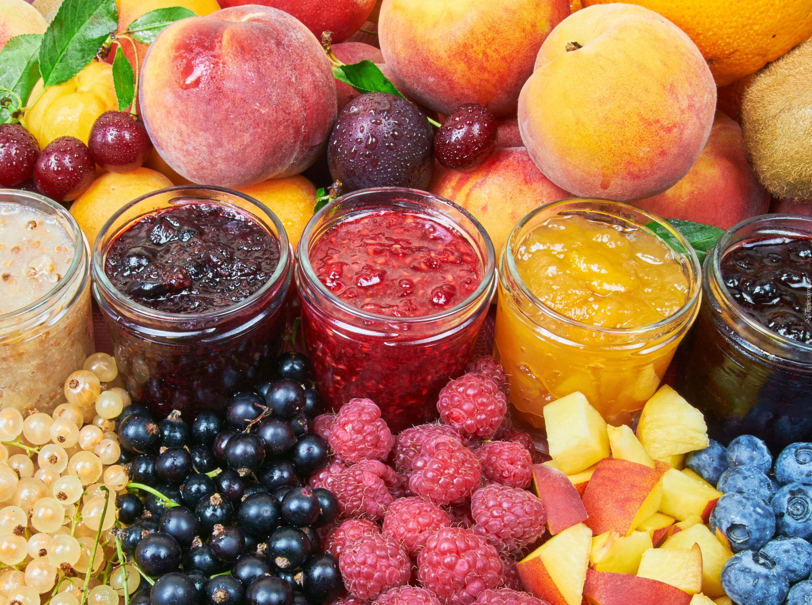 Edytor tapety: Owoce ułożone obok dżemów w słoiczkach