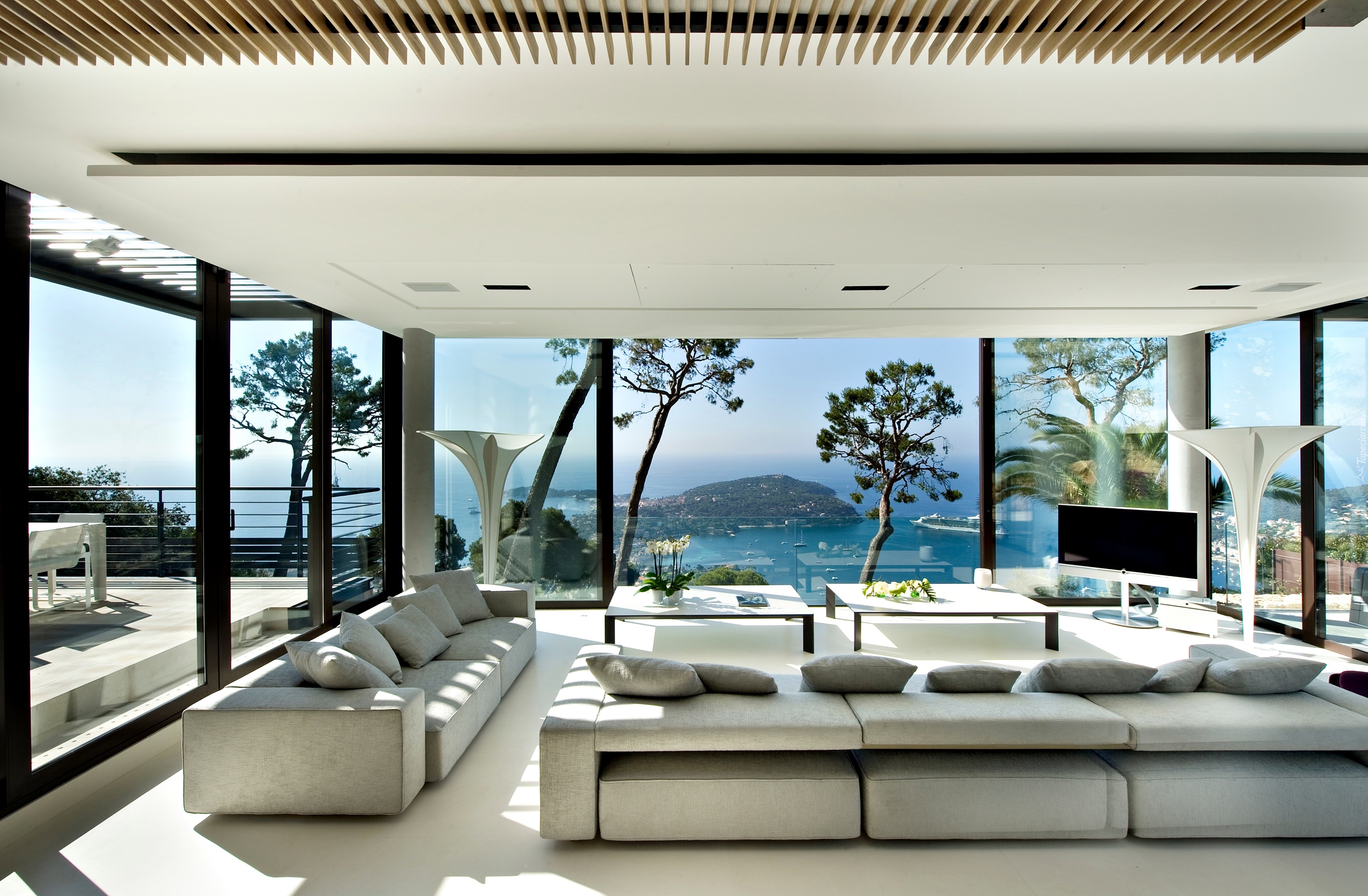 Edytor tapety: Jasny umeblowany salon z widokiem na morze