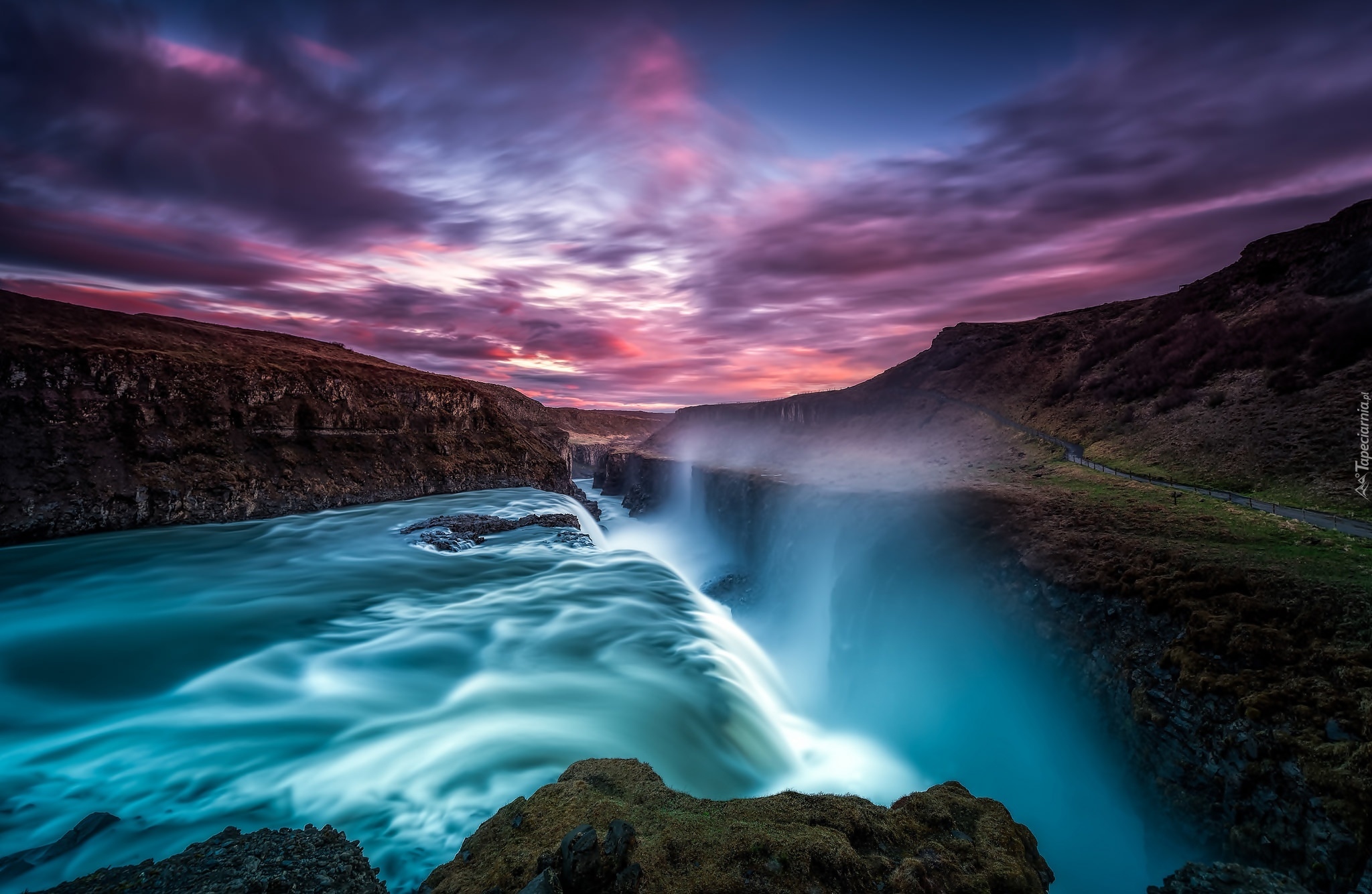Edytor tapety: Zachód słońca nad wodospadem Gullfoss w Islandii