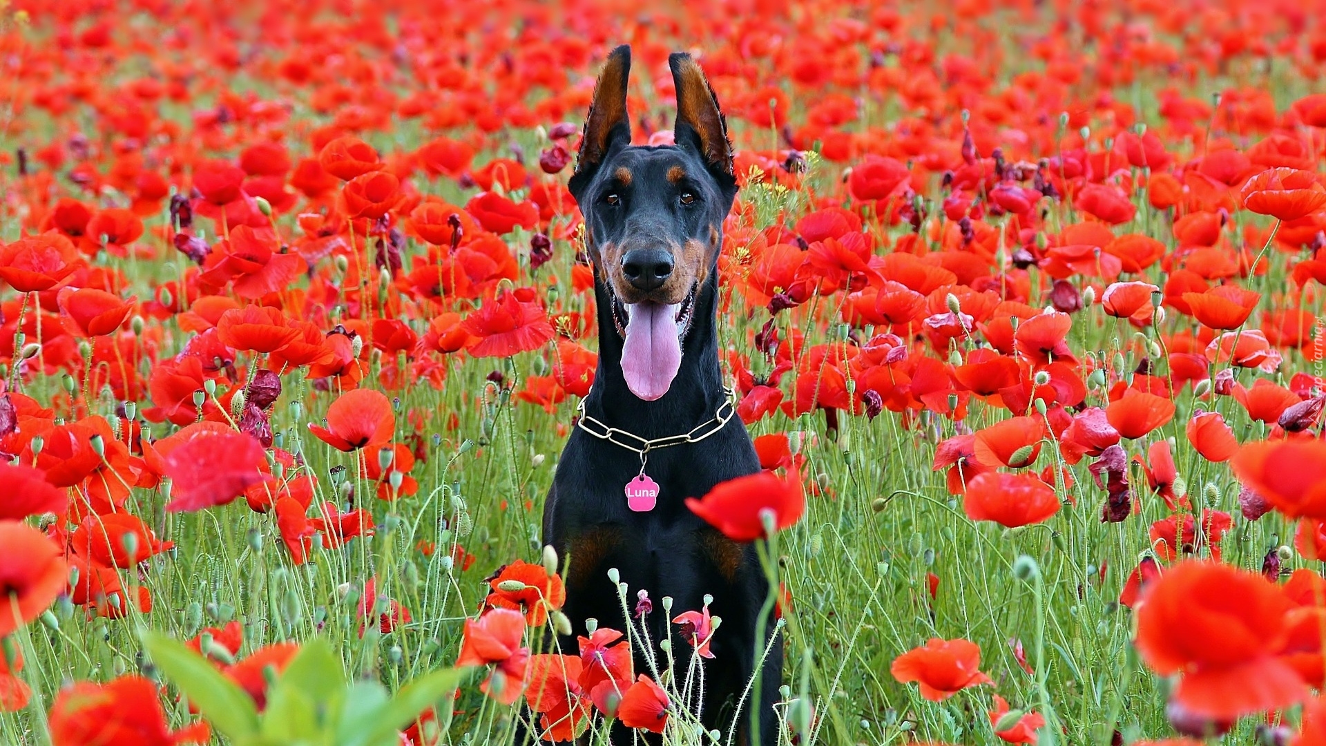 Edytor tapety: Doberman na makowej łące