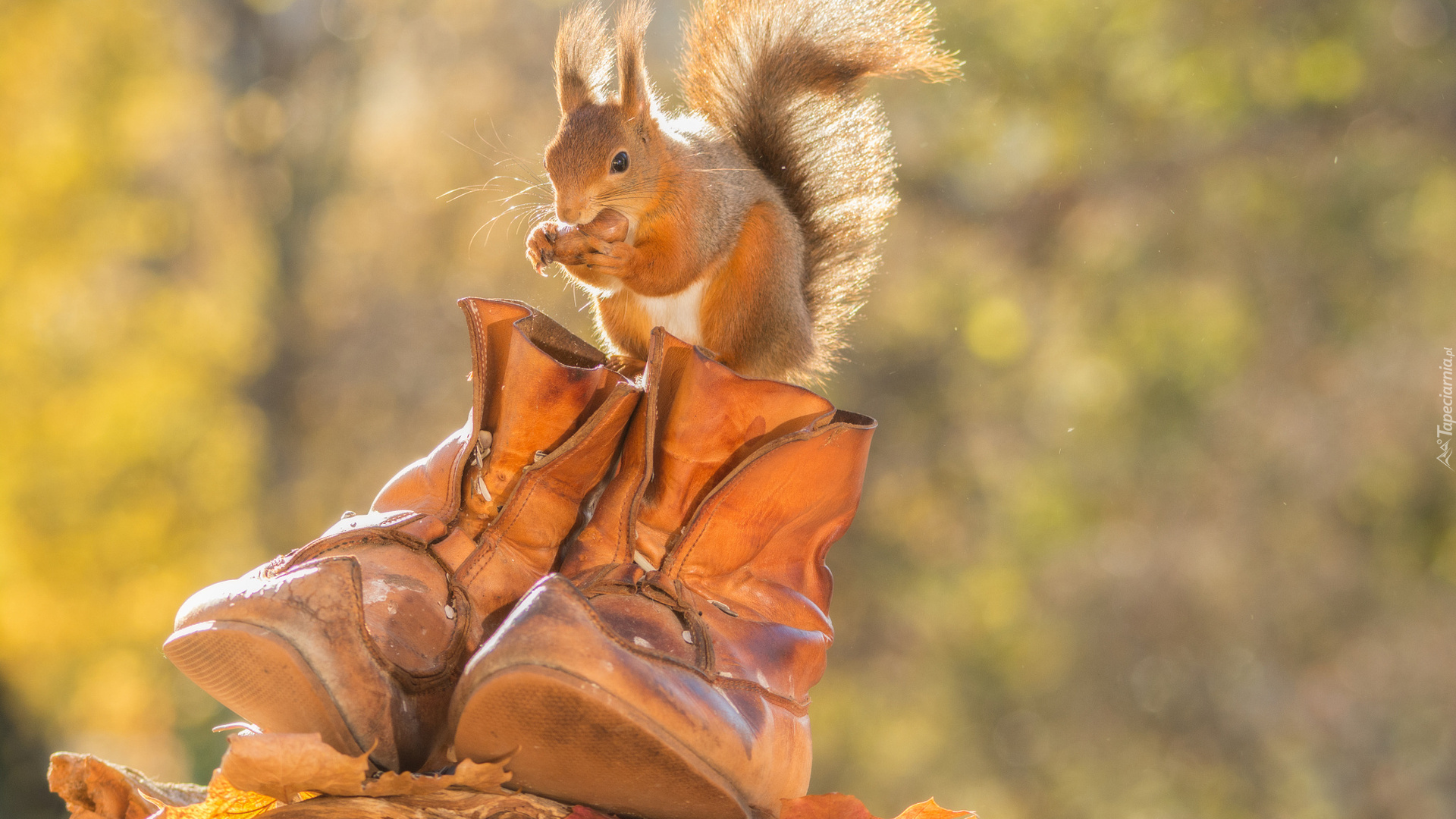 Edytor tapety: Wiewiórka z orzeszkiem stoi na butach