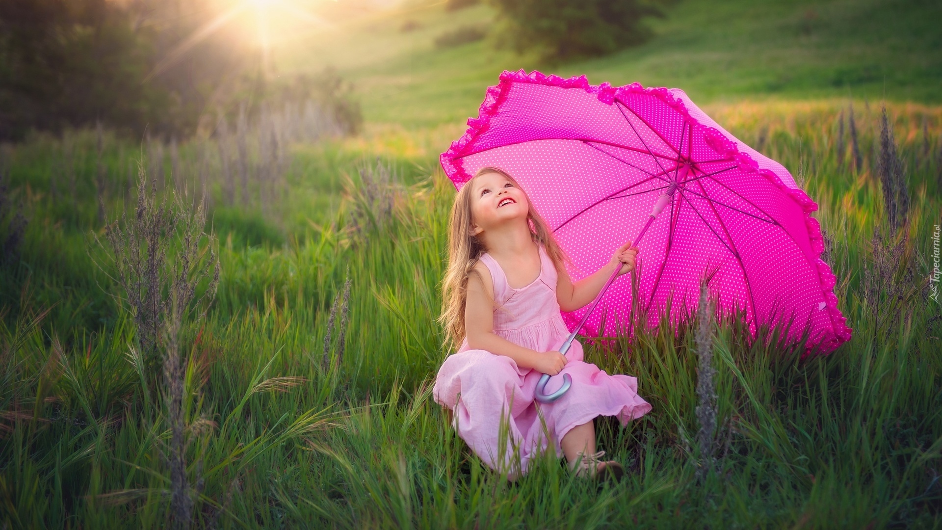 Edytor tapety: Dziewczynka z różowym parasolem na łące