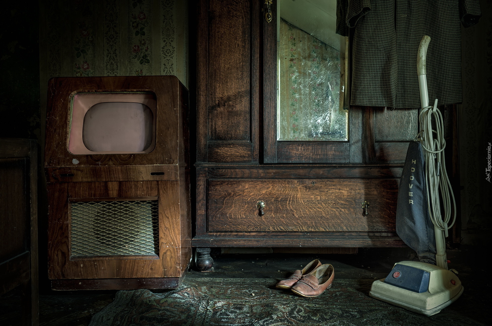 Edytor tapety: Telewizor obok starodawnej szafy z lustrem i odkurzacza
