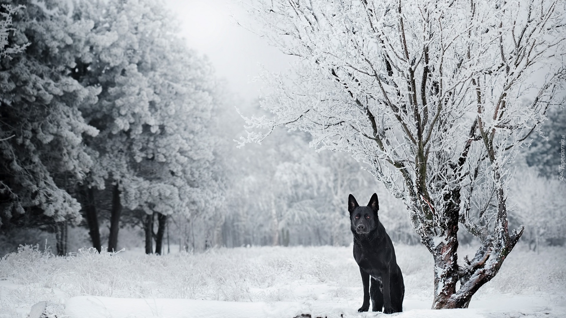 Edytor tapety: Czarny owczarek niemiecki pod drzewem zimą