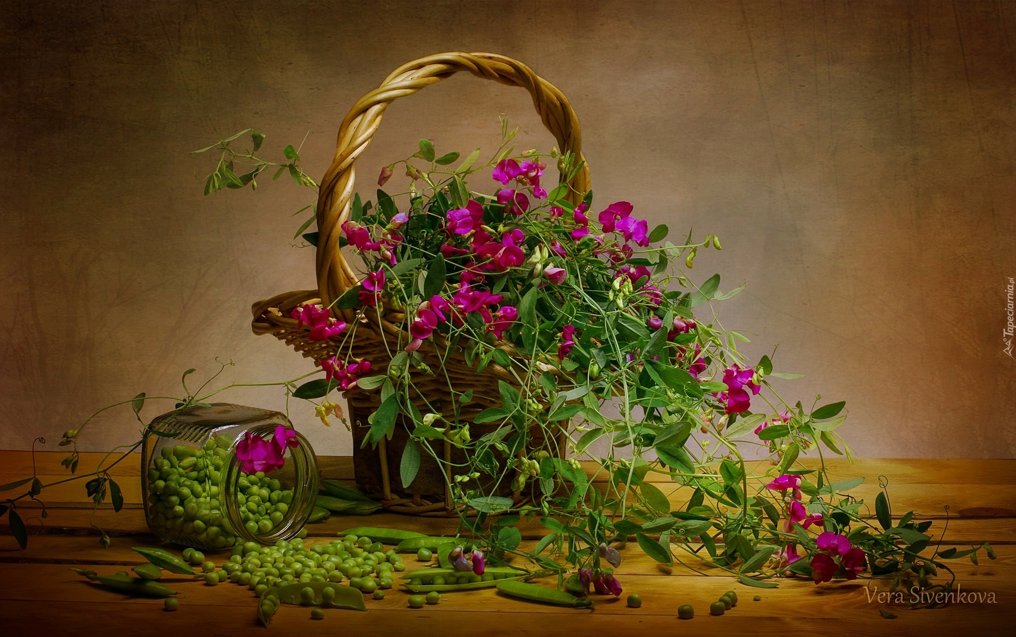 Edytor tapety: Kompozycja z groszkiem pachnącym w koszyczku