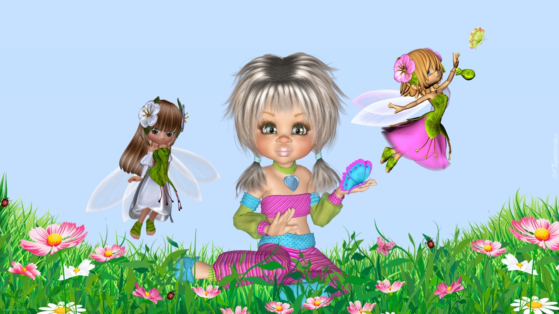 Edytor tapety: Laleczki i motylki na łące w grafice 2D