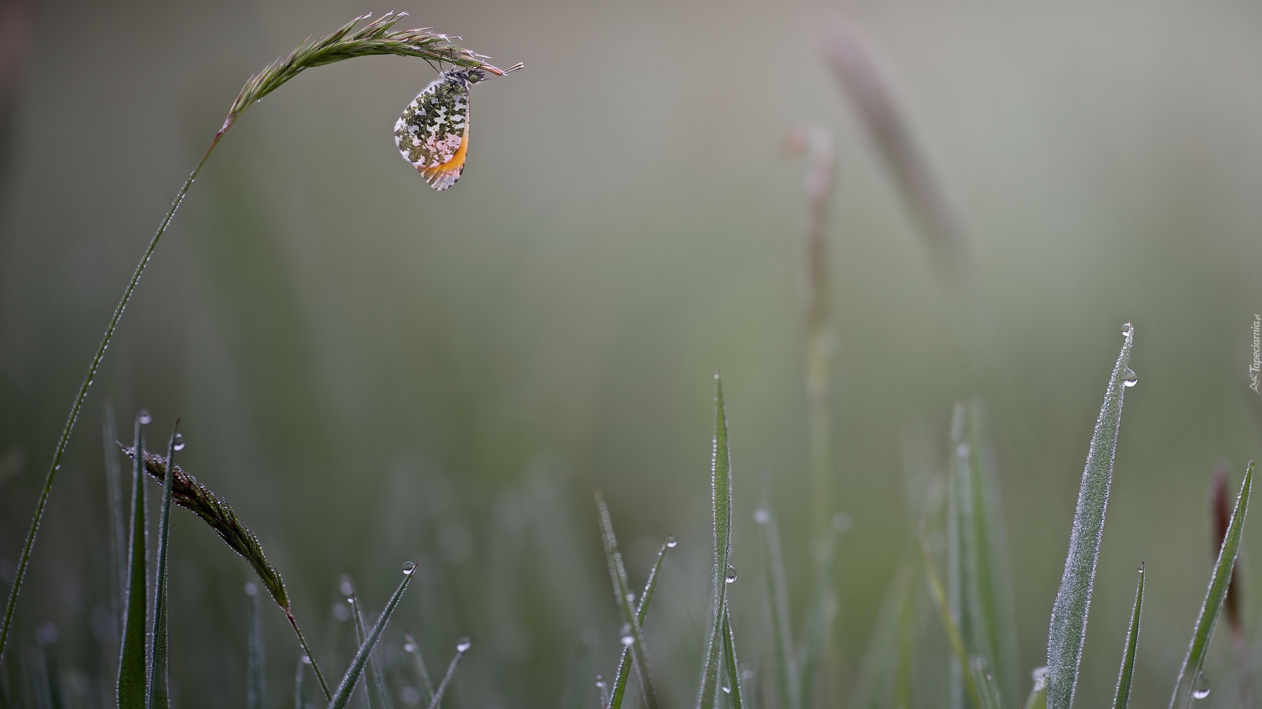 Edytor tapety: Motyl na źdźble trawy z kropelkami rosy