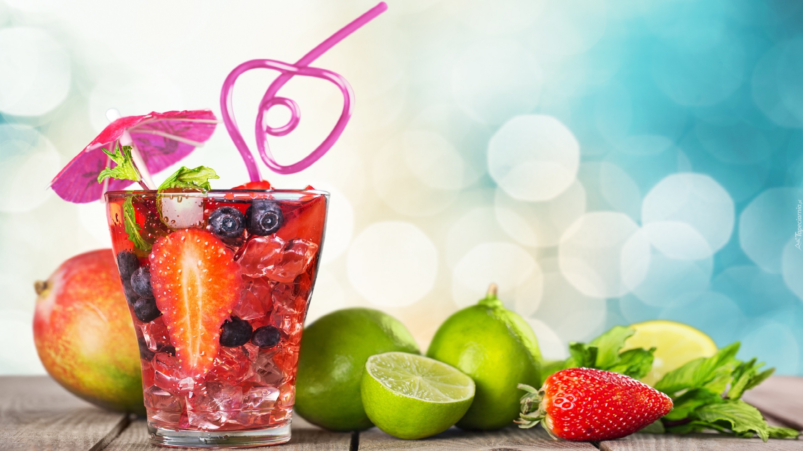 Edytor tapety: Owocowy sok w szklance ze słomką i parasoleczką