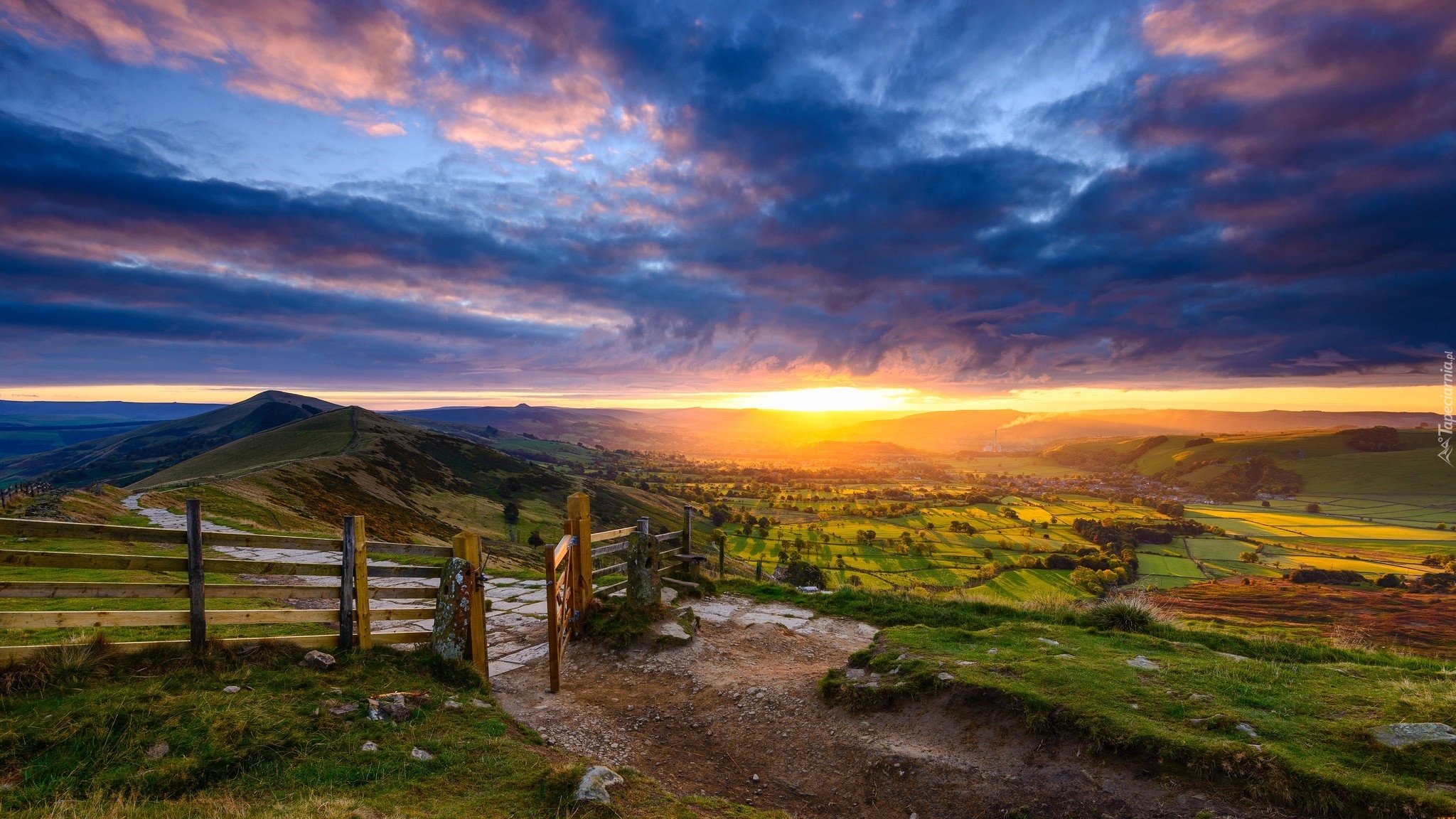 Edytor tapety: Widok na łąki w dolinie o zachodzie słońca