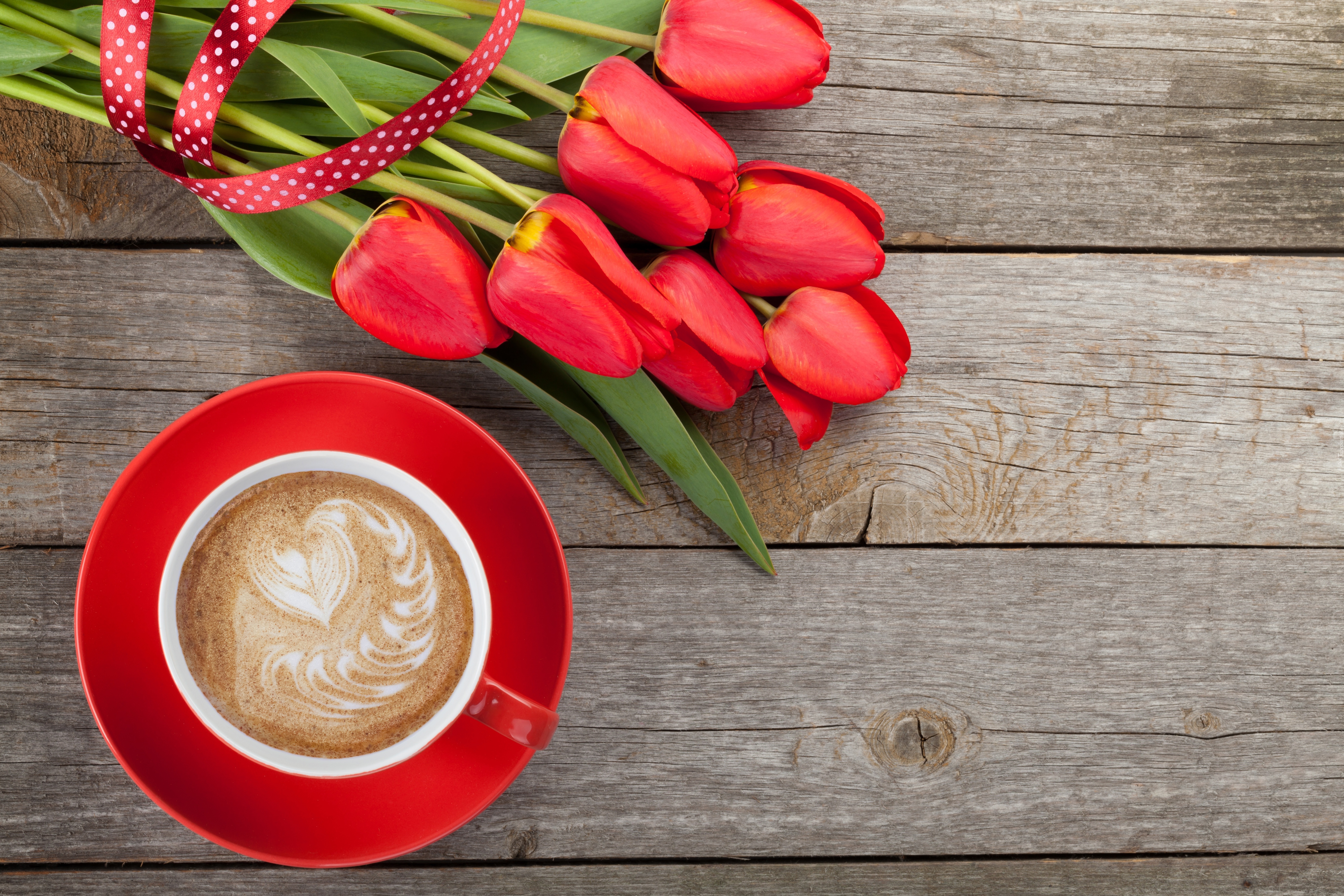 Edytor tapety: Kawa w czerwonej filiżance obok bukietu tulipanów