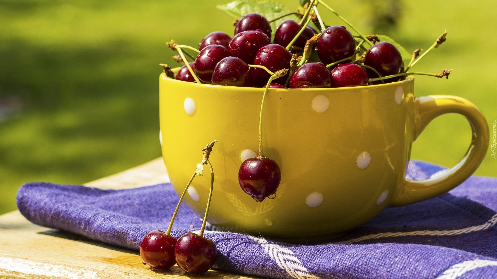 Edytor tapety: Żółta filiżanka wypełniona czereśniami