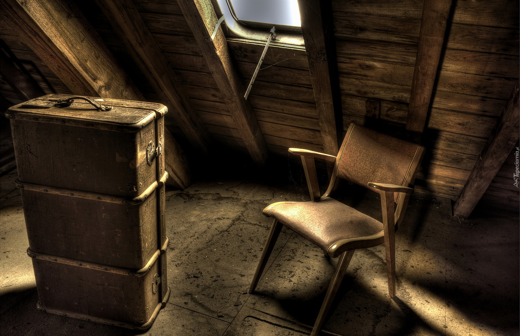 Edytor tapety: Stara walizka obok krzesła na strychu