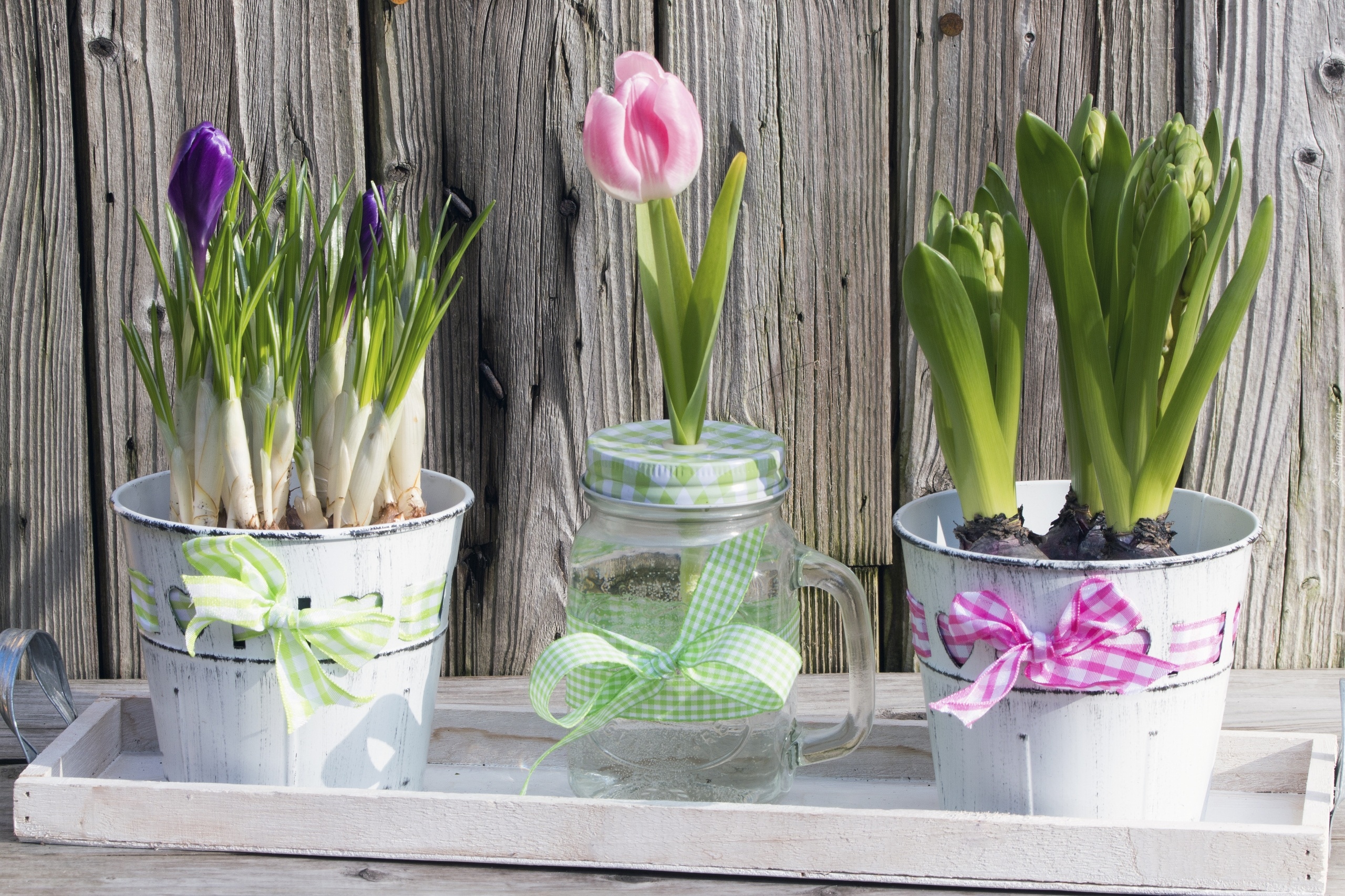 Edytor tapety: Tulipan w słoiku obok krokusów w wiaderku
