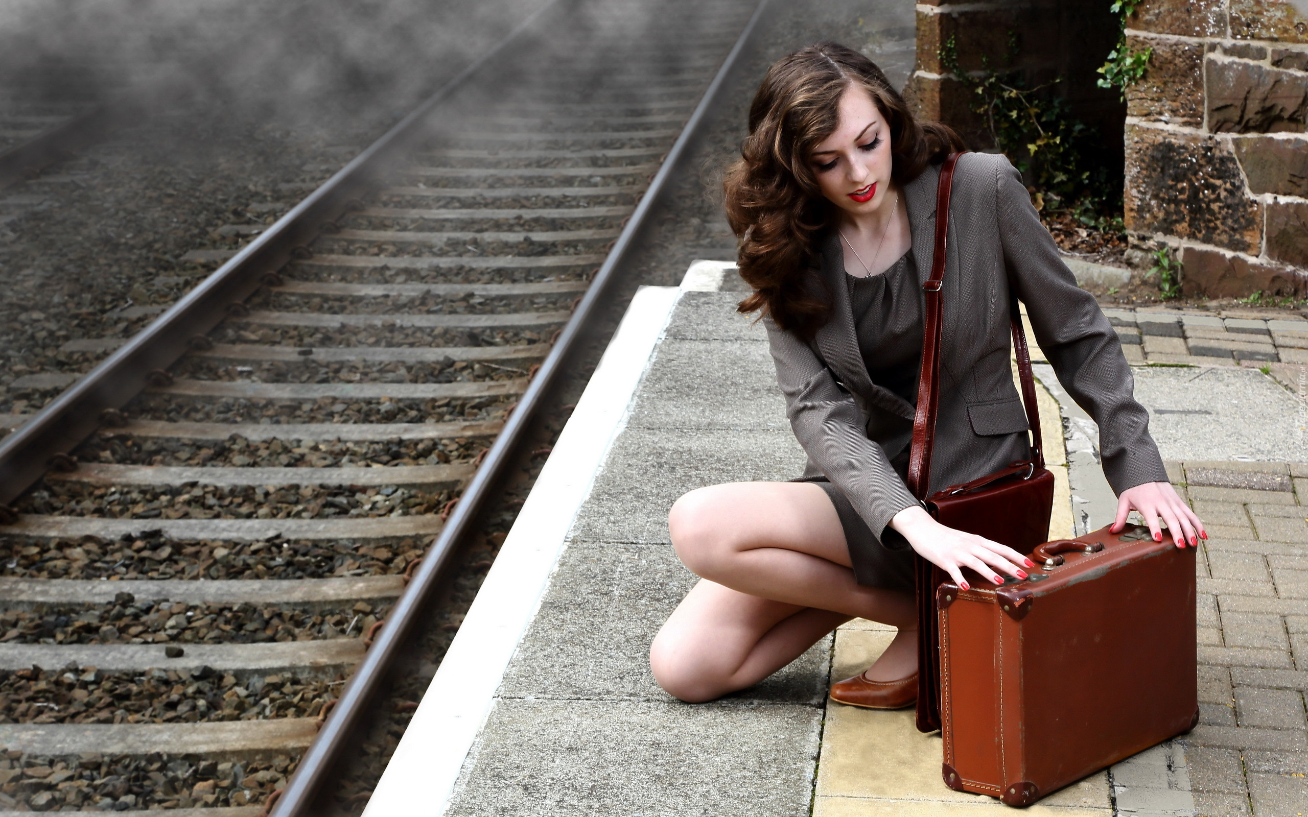Edytor tapety: Dziewczyna z walizką na peronie przy torach kolejowych