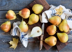 Edytor tapety: Gruszki i nóż położone na drewnianej desce