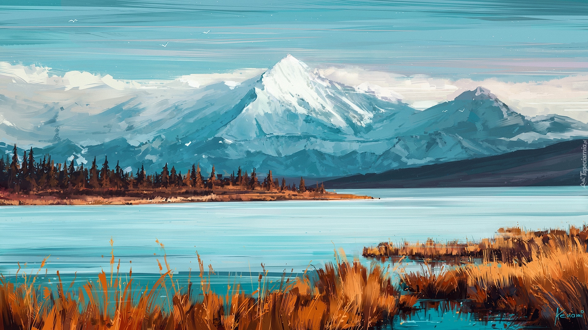 Edytor tapety: Góry nieopodal jeziora w grafice paintography