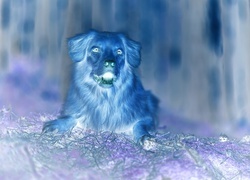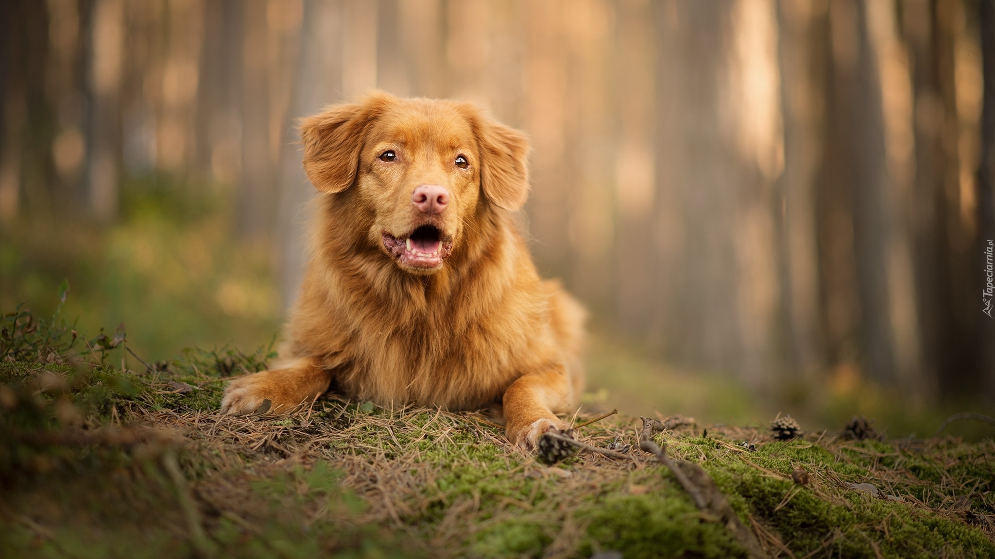 Edytor tapety: Retriever z Nowej Szkocji leży na leśnej ściółce