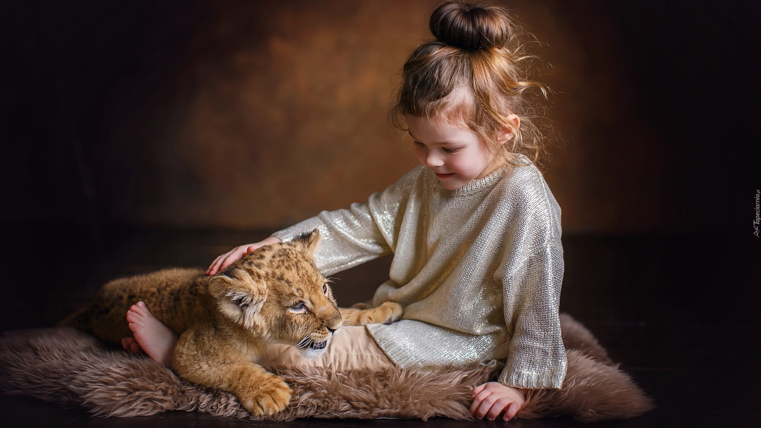 Edytor tapety: Dziewczynka głaszcze małe lwiątko