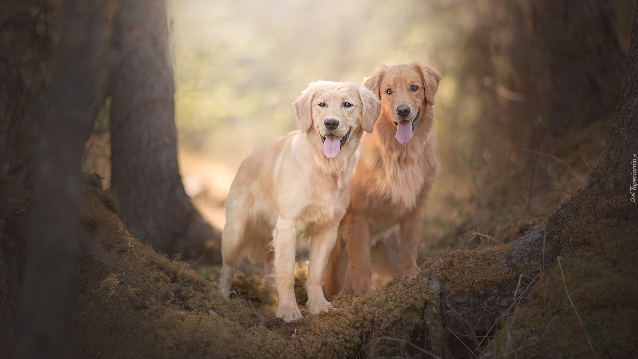 Edytor tapety: Dwa golden retrievery na mchu między drzewami