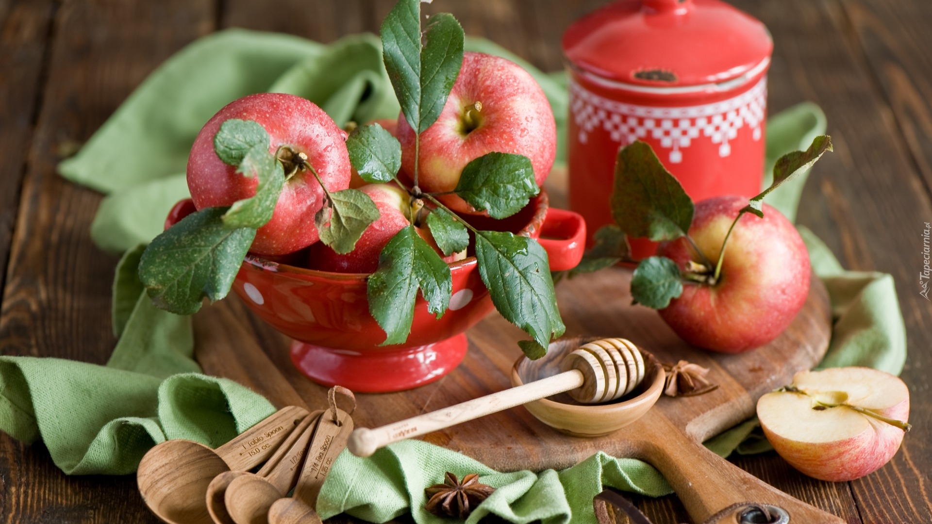 Edytor tapety: Jabłka w naczyniu i na desce obok łyżki