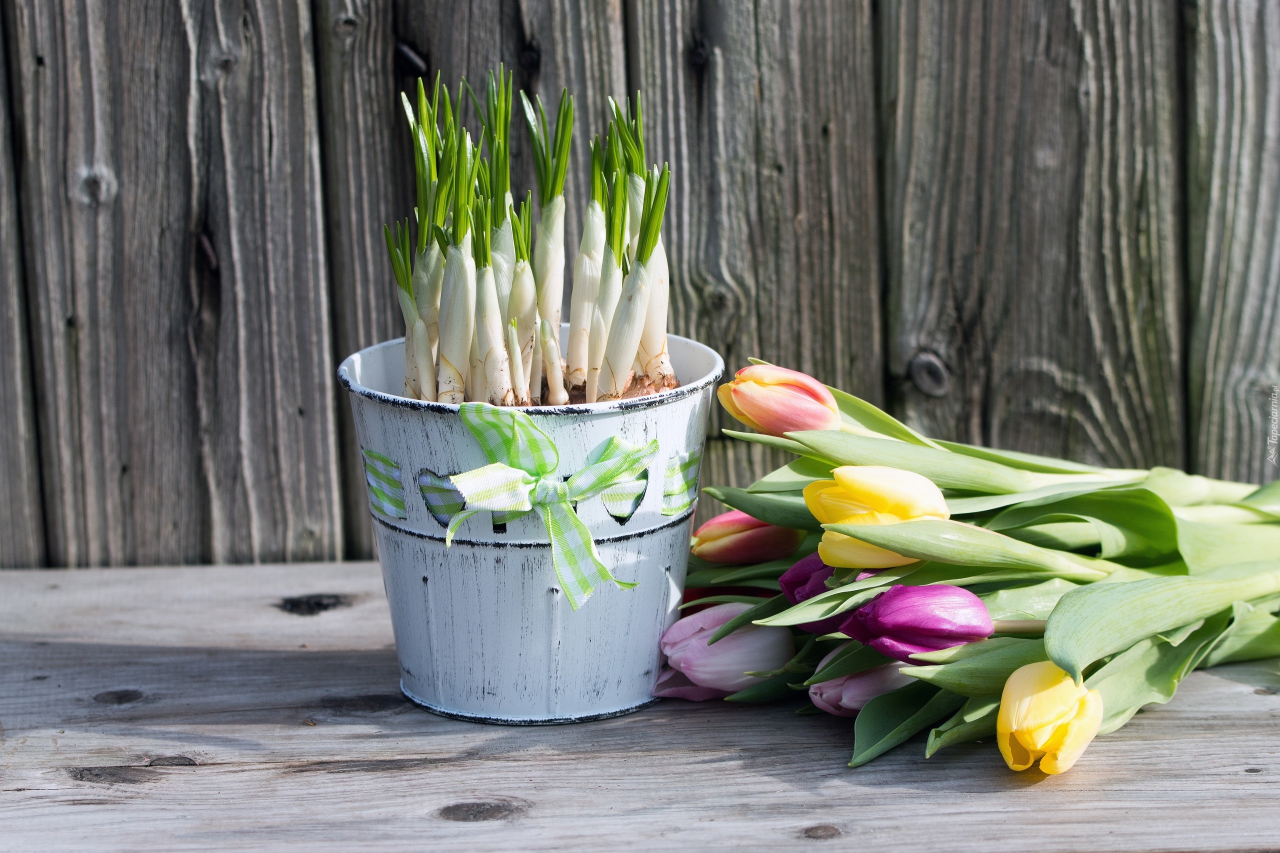 Edytor tapety: Bukiet kolorowych tulipanów obok roślin w wiaderku