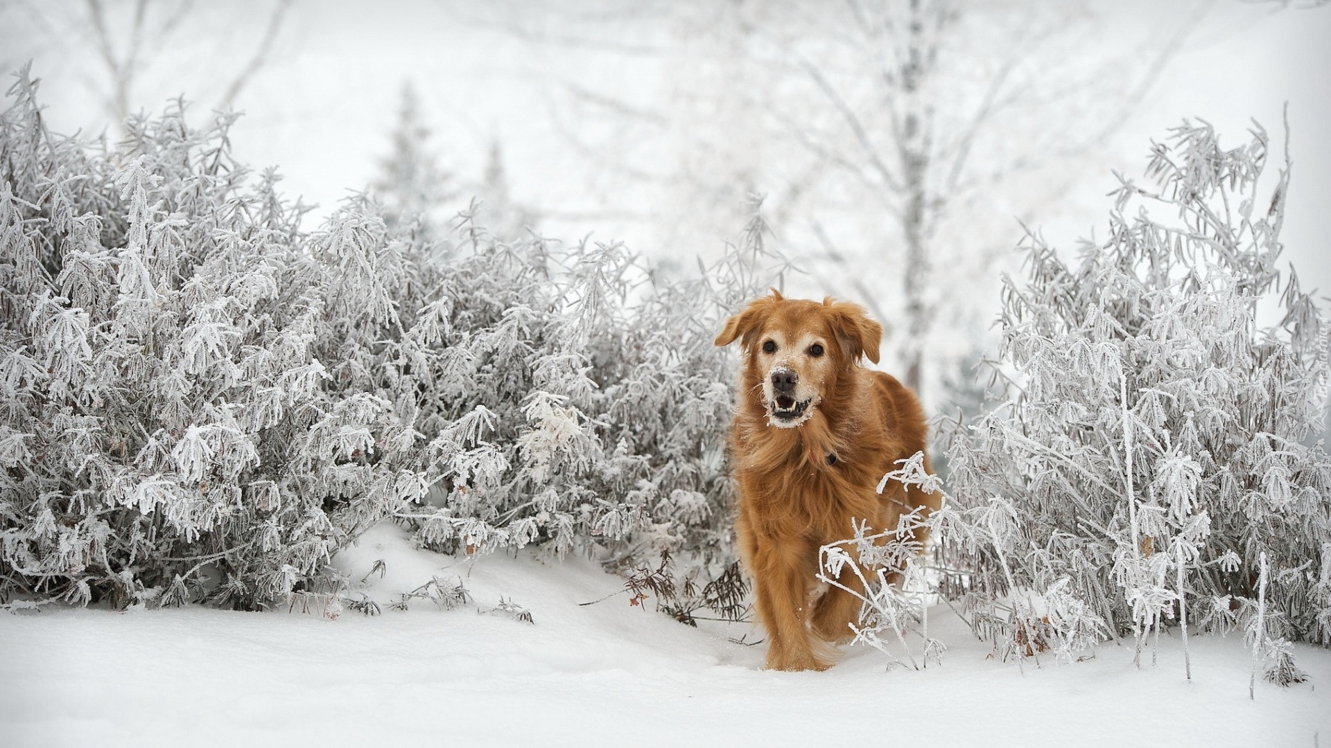 Edytor tapety: Golden retriever na śniegu między oszronionymi krzewami