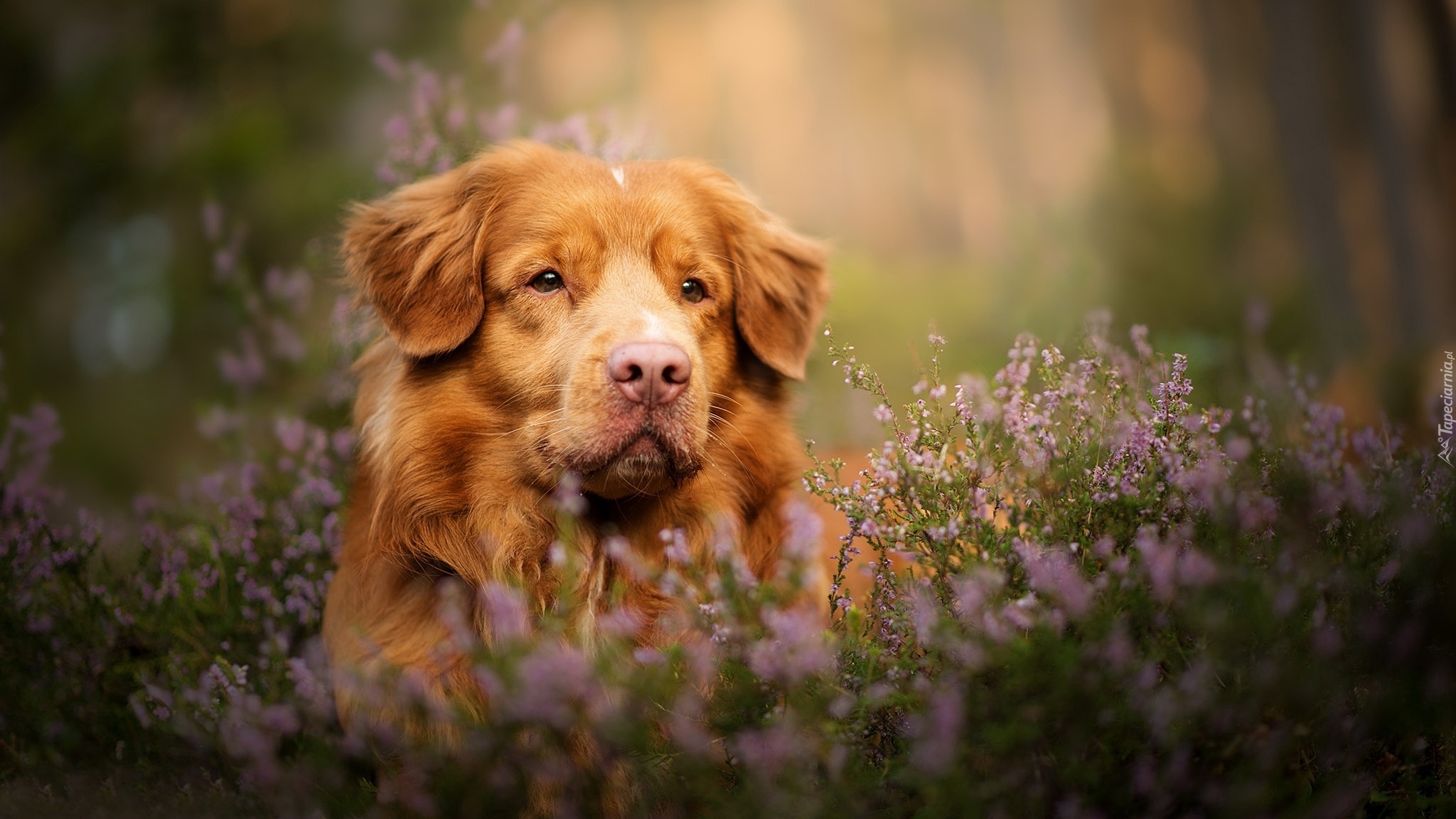 Edytor tapety: Retriever z Nowej Szkocji we wrzosach