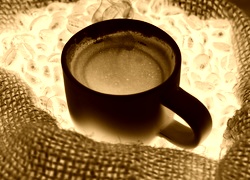 Edytor tapety: Parująca filiżanka kawy w worku z ziarnami