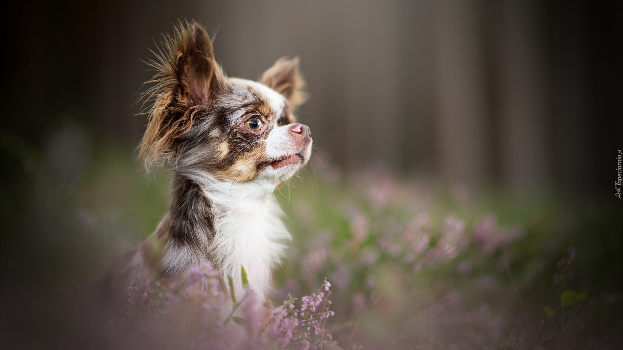 Edytor tapety: Chihuahua długowłosa we wrzosach