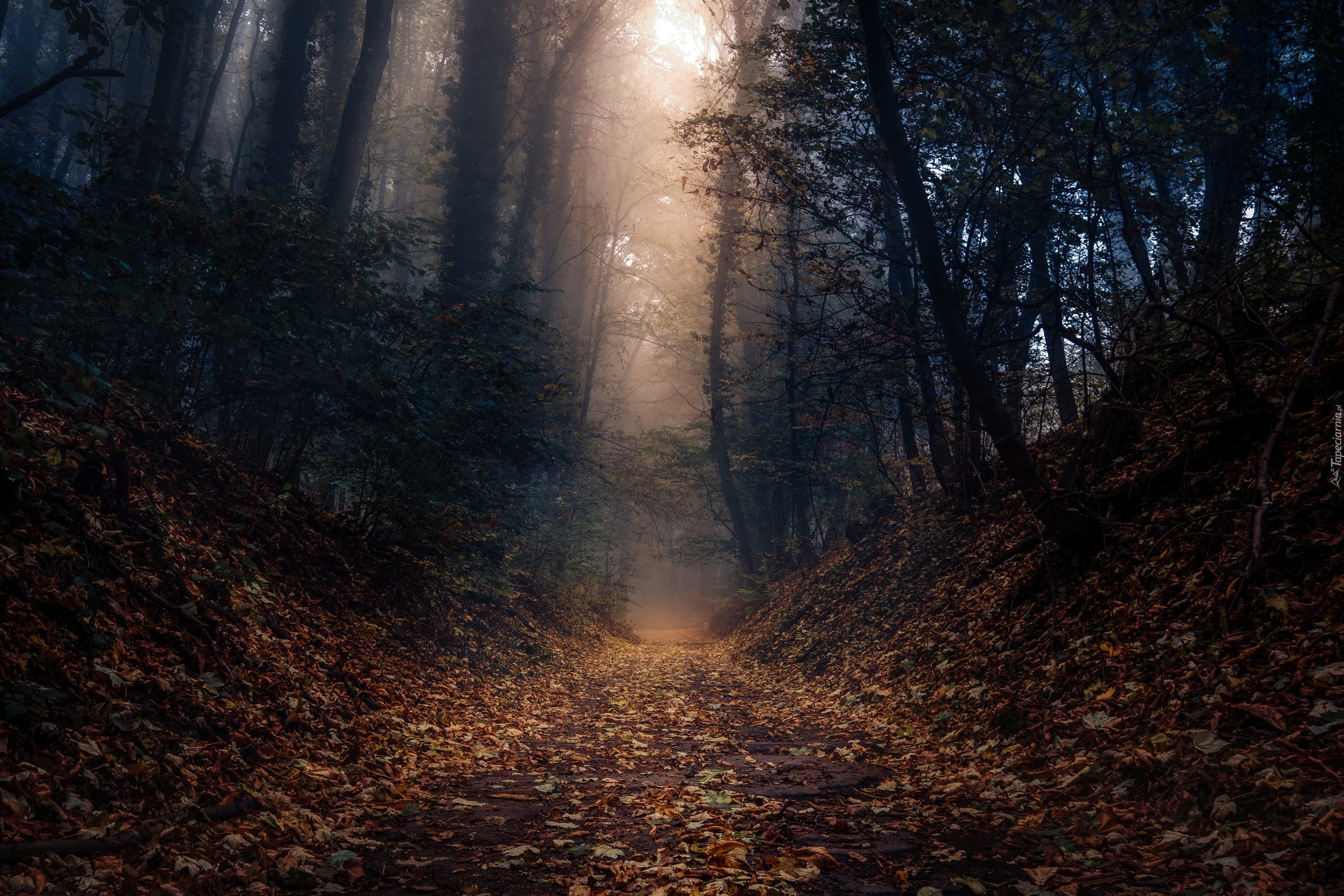 Edytor tapety: Droga zasypana liśćmi w zamglonym lesie