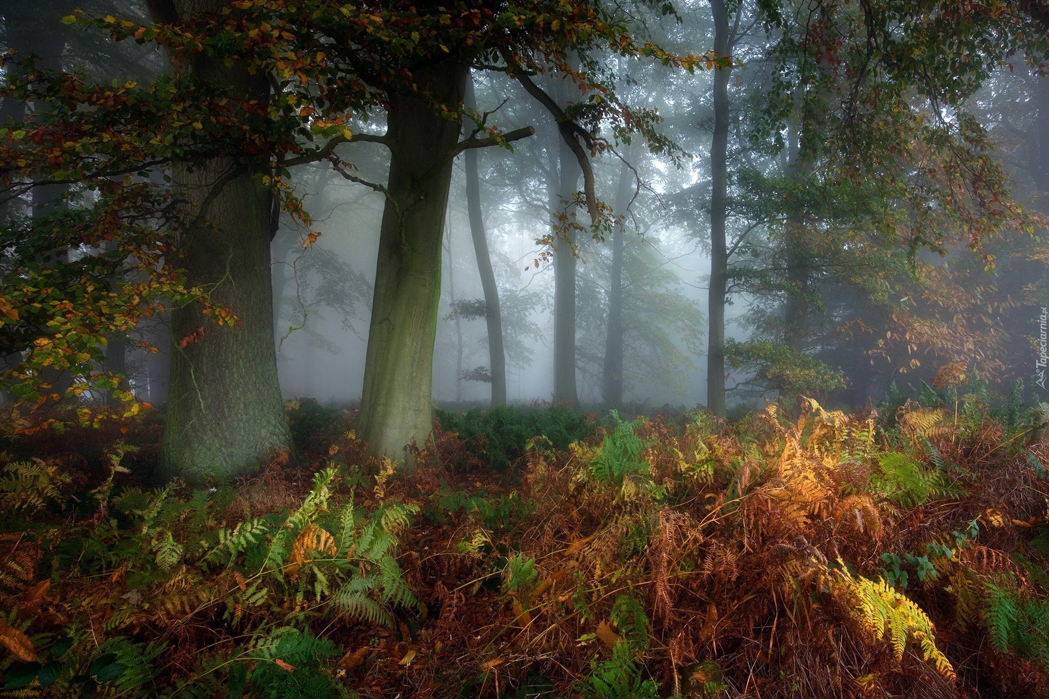 Edytor tapety: Paprocie porastające zamglony jesienny las