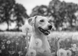 Edytor tapety: Labrador retriever pośród dmuchawców na łące