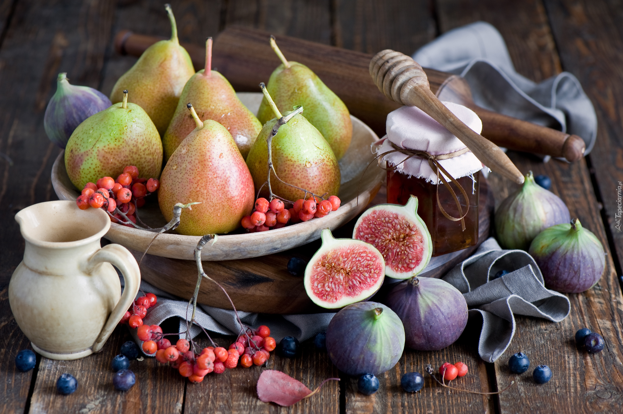 Edytor tapety: Kompozycja z gruszek, fig i gałązek jarzębiny