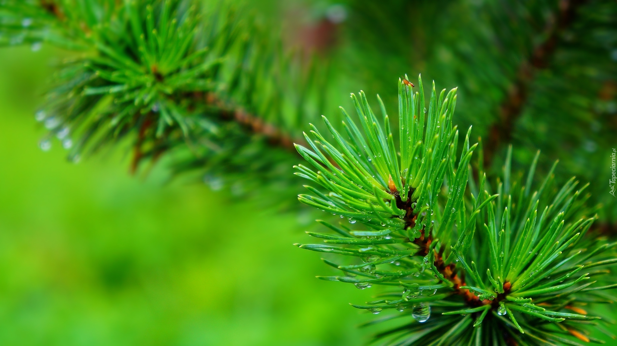 Edytor tapety: Krople deszczu na zielonej gałązce sosny