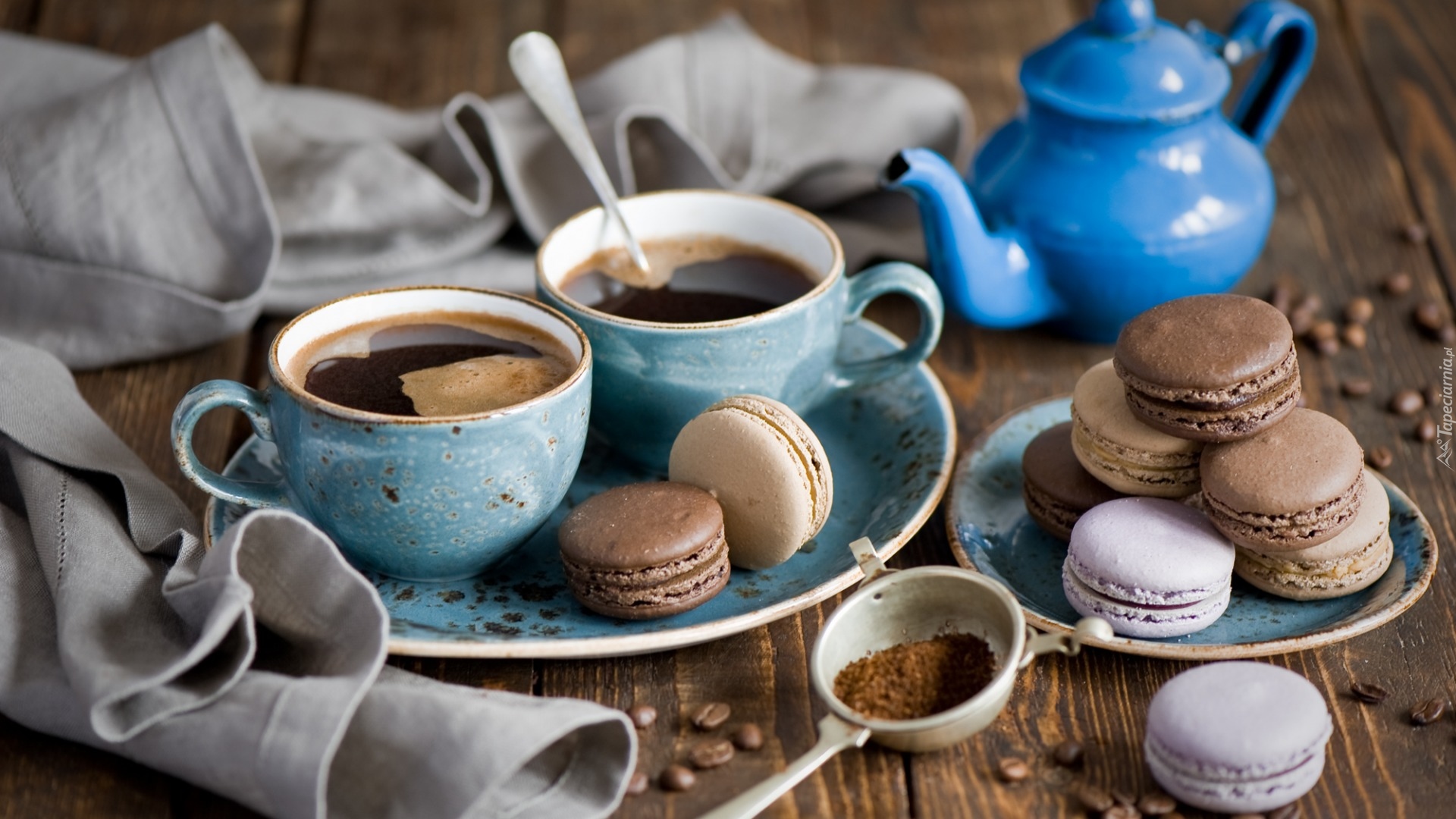 Edytor tapety: Filiżanki z kawą obok ciasteczek makaroników na talerzyku