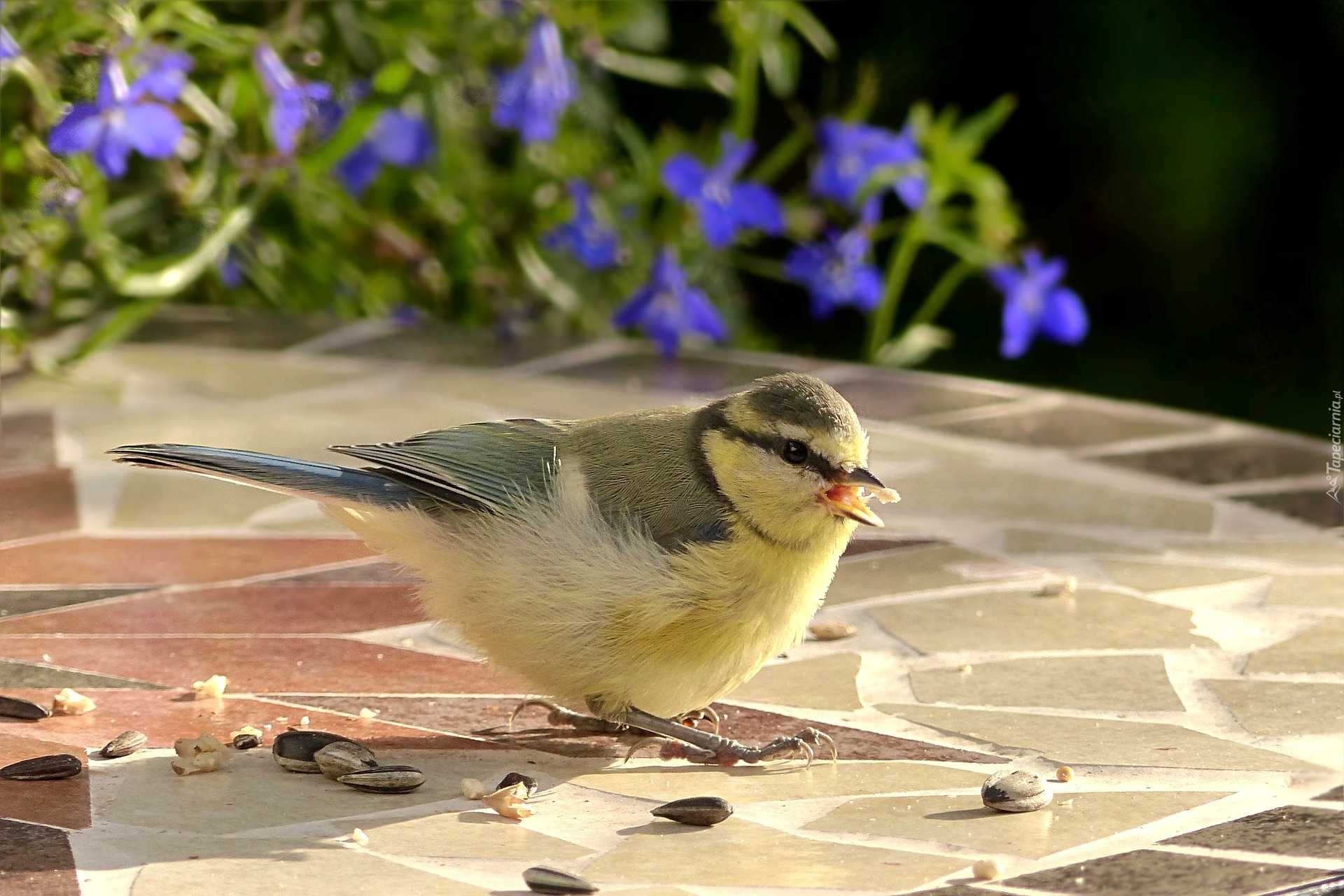 Edytor tapety: Modraszka zwyczajna podczas konsumpcji ziaren słonecznika