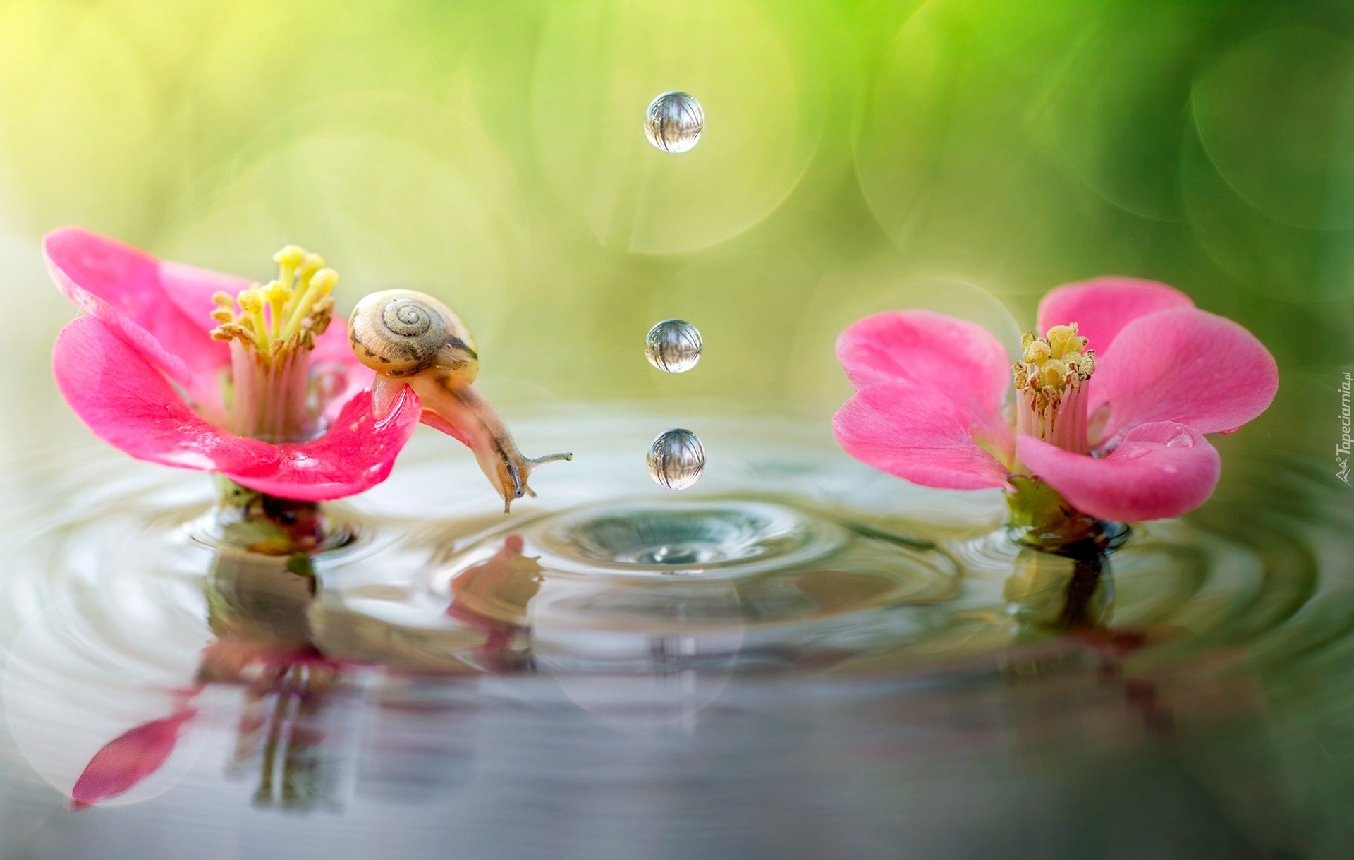 Edytor tapety: Ślimak na kwiatku obok kropel wpadających do wody
