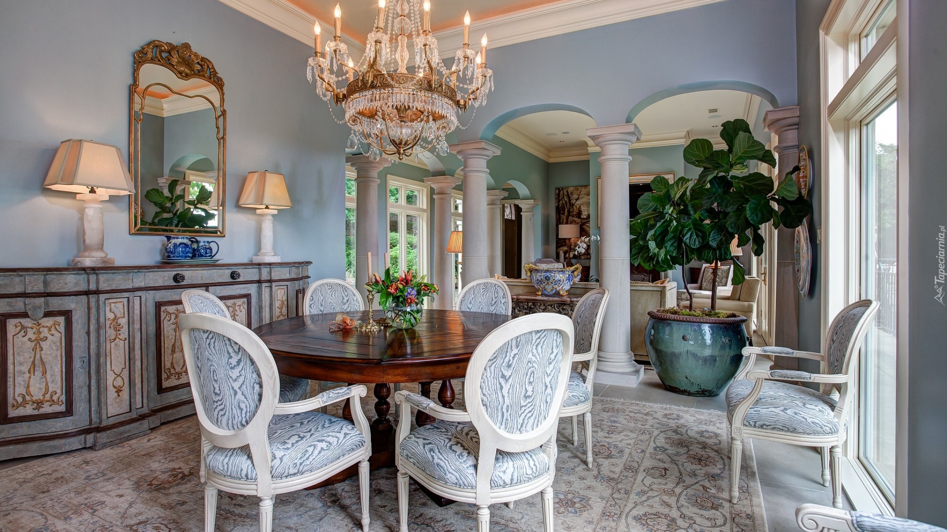 Edytor tapety: Stylowa jadalnia z okazałym żyrandolem