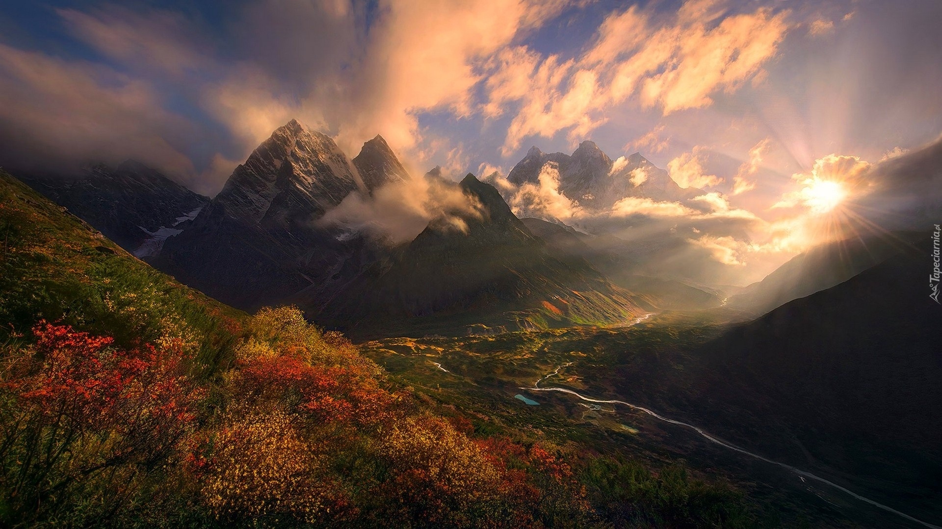 Edytor tapety: Dolina w Himalajach o zachodzie słońca