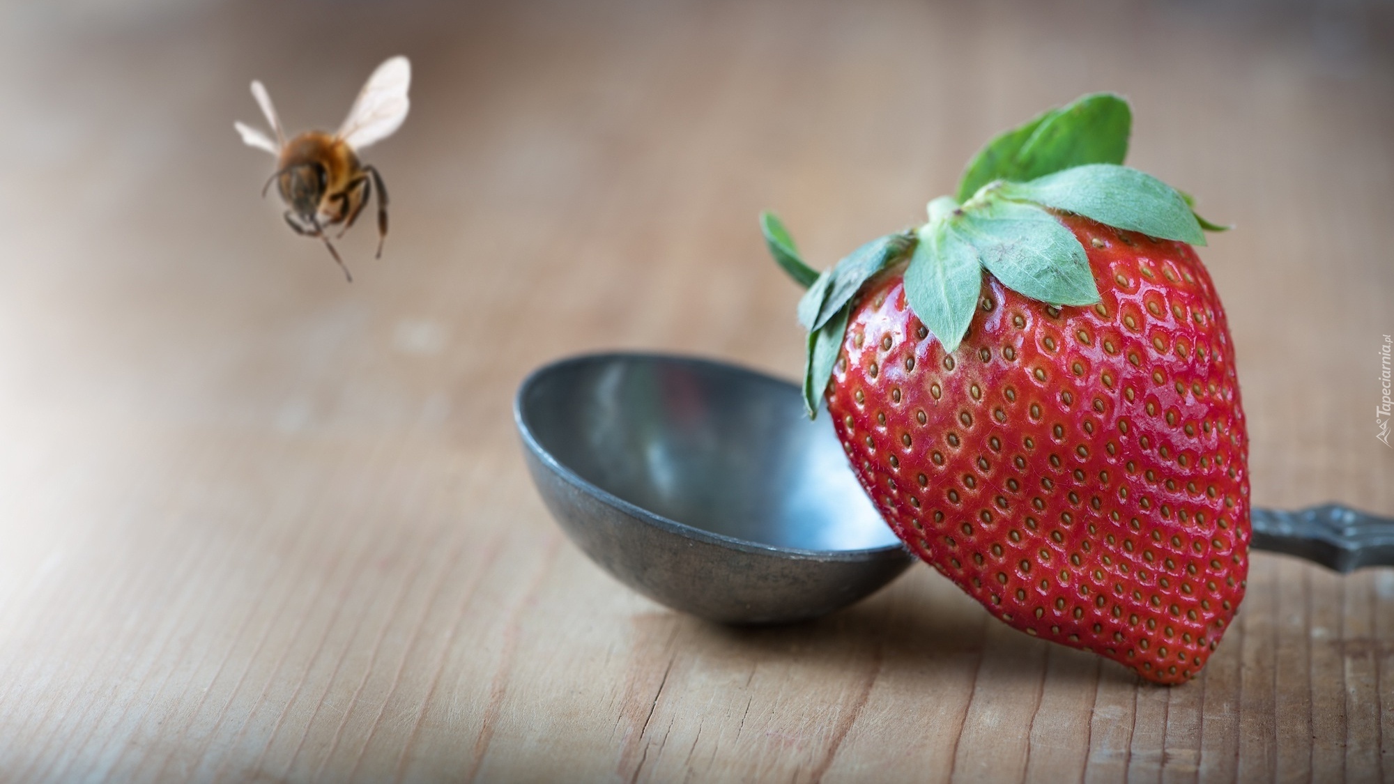 Edytor tapety: Pszczoła latająca w pobliżu truskawki z łyżką