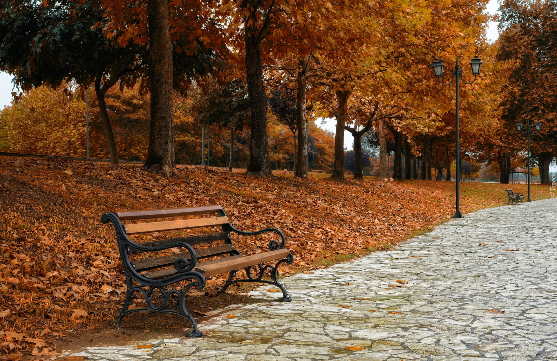 Edytor tapety: Ławeczka przy alejce w jesiennym parku