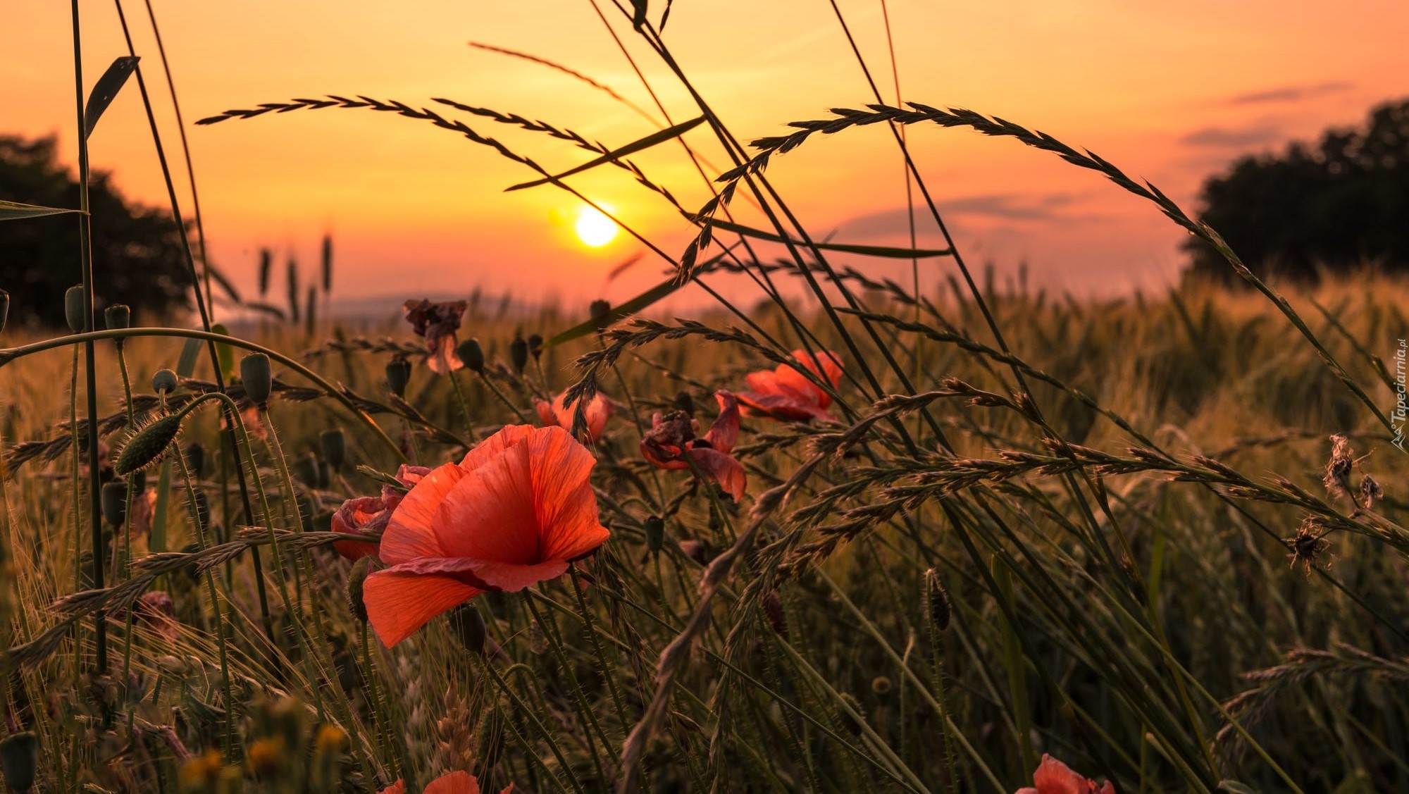 Edytor tapety: Maki między źdźbłami trawy w zachodzącym słońcu