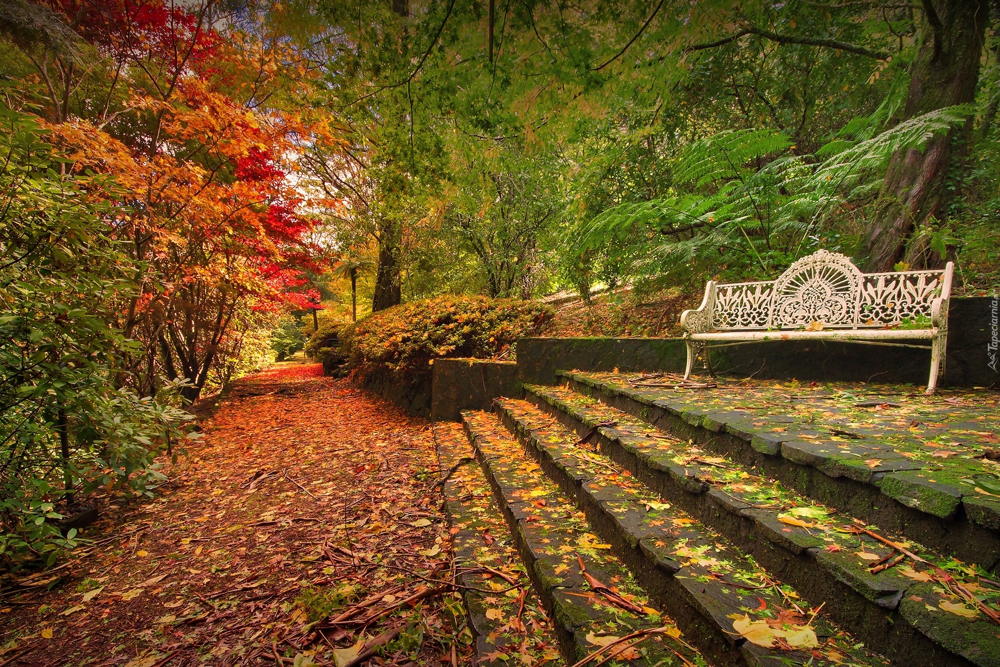 Edytor tapety: Ławka przy schodach w parku jesienią