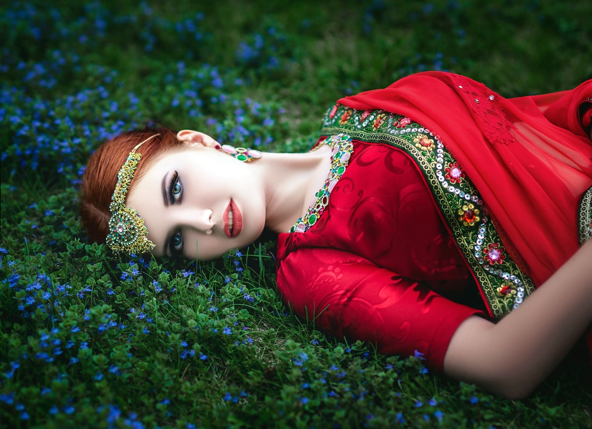 Edytor tapety: Kobieta w orientalnym stroju leżąca na trawie