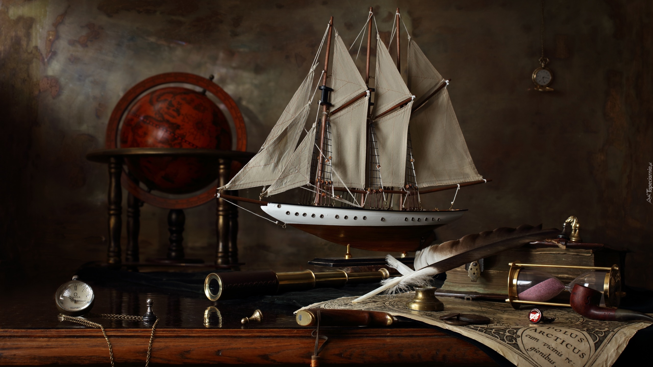 Edytor tapety: Miniaturka statku obok globusa i lunety na stoliku
